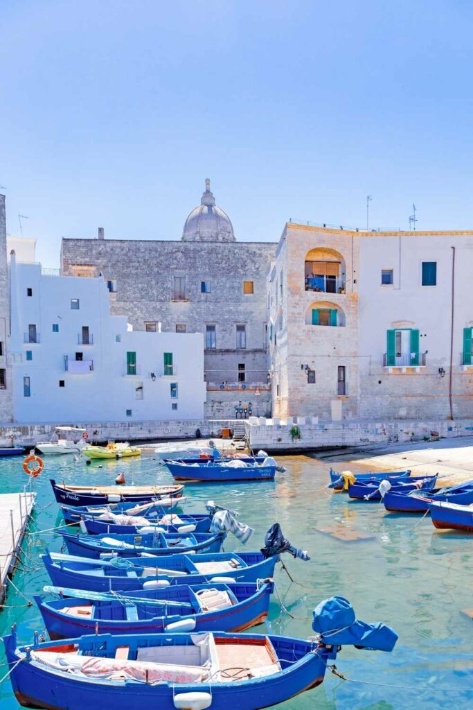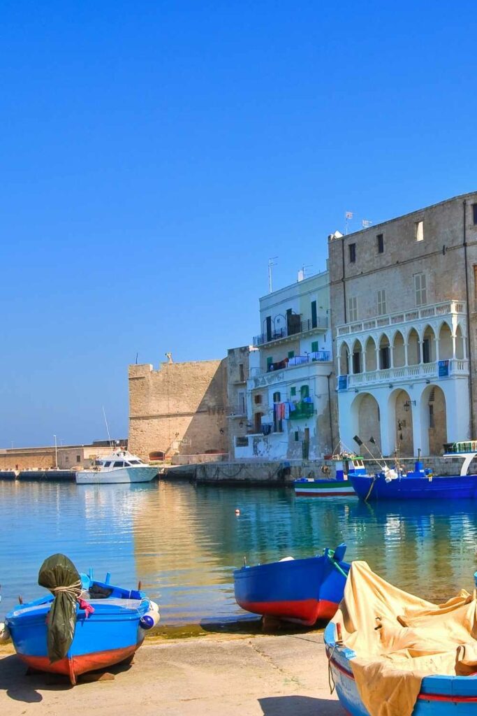 Le Porto Antico reste l’un des plus jolis coins à visiter à Monopoli : barques bleues, murs ocres, calme. Depuis là, tu peux longer les remparts, marcher jusqu’au château, et comprendre comment la ville s’est construite autour de la mer.