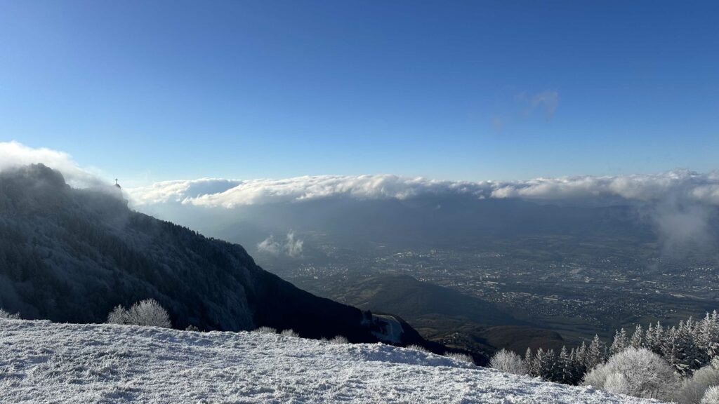 La croix du Nivolet, haute d’environ 20 m, est un repère que tu peux distinguer de loin. Près de la croix, au sommet, tu trouveras un espace suffisamment plat pour faire une pause. Profite d’une vue à 360° sur le bassin chambérien, le lac du Bourget si la visibilité est bonne, et plusieurs massifs alpins comme les Bauges ou Belledonne.