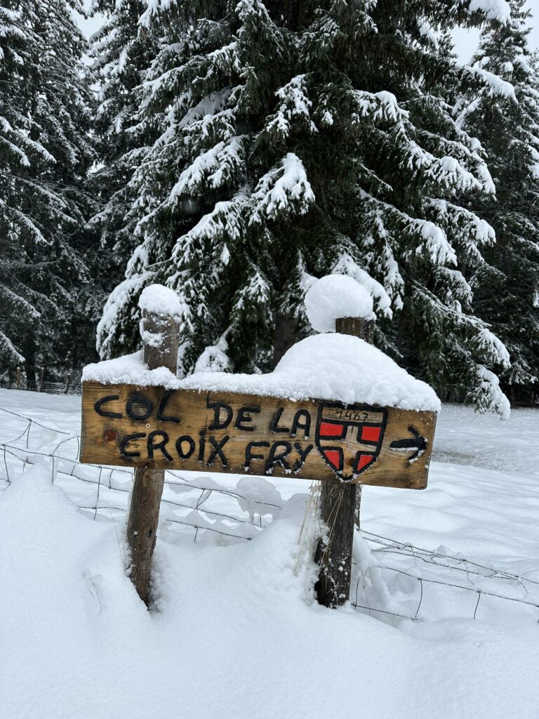 Depuis le col de la Croix Fry, tu peux faire plusieurs boucles : la Croix de Colomban (1691 m), les Frêtes de Beauregard, ou pousser jusqu’à la Pointe de Beauregard. Le balisage est nickel avec des piquets « piétons raquettes » à suivre.