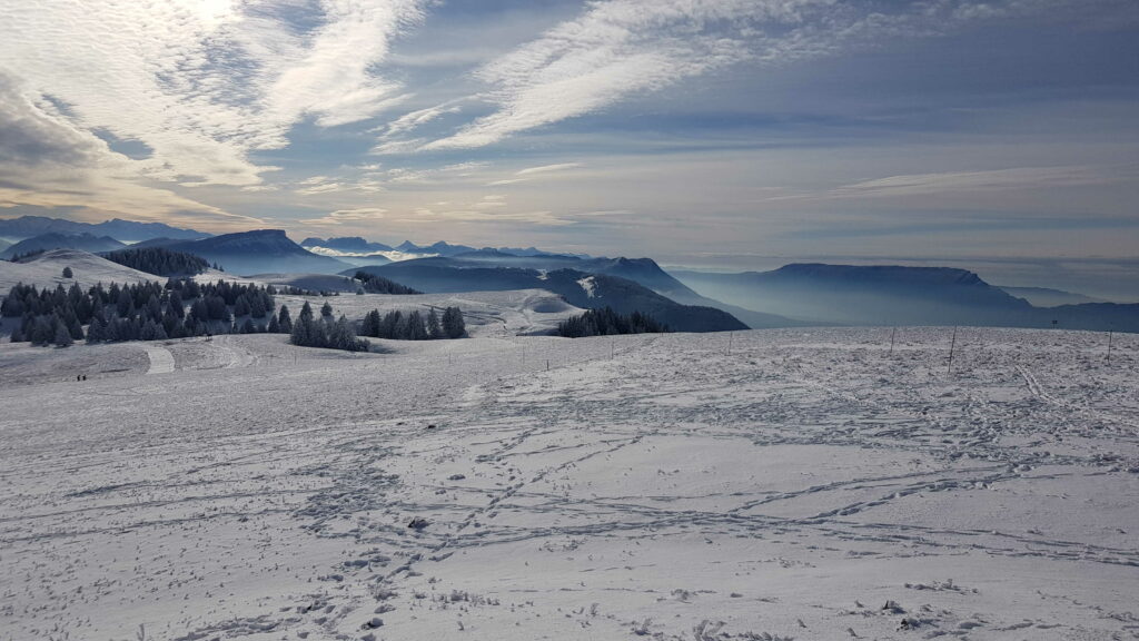 Le parcours traverse le plateau avec des vues dégagées sur le lac d’Annecy, les Aravis et le Mont-Blanc par temps clair. Tu passes près de petits lacs gelés en hiver, d’où le nom. Le balisage est bien visible, et comme c’est souvent damé, tu peux même le faire à pied si la neige est tassée.