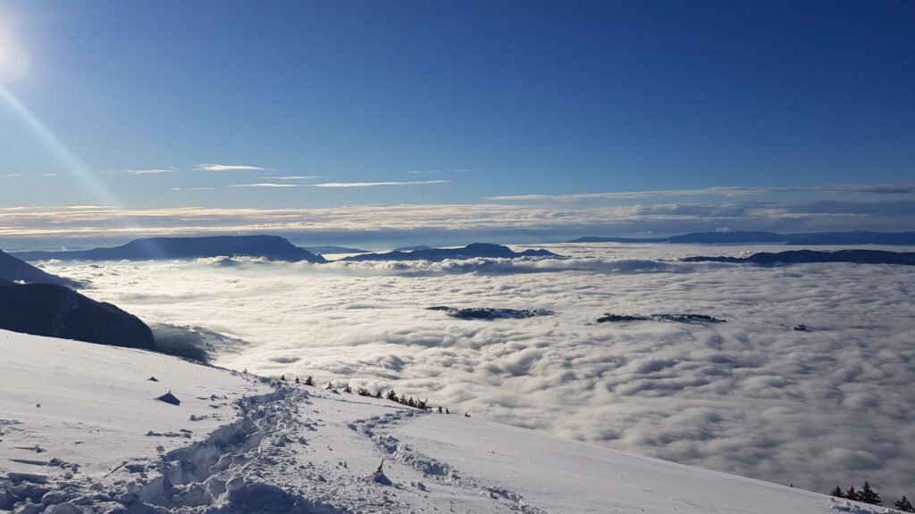 Le Semnoz, c’est un peu la deuxième maison quand tu vis à Annecy. En 25 à 30 minutes de voiture, tu passes du bord du lac aux pistes de ski, ski de fond et chemins de raquettes avec vue panoramique. L’hiver, le parking se remplit vite les week-ends ensoleillés…encore plus vite quand il y a une belle mer de nuages, mais ça reste le spot le plus accessible pour une sortie rapide. Et sur certaines périodes on peut même y accéder en bus !